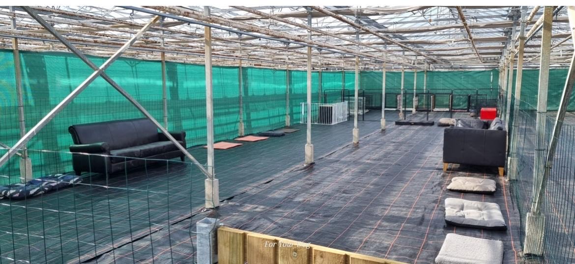 Wij hebben hier ook de dagopvang. De binnenlocatie is 500m2. De honden rusten hier tussen de middag. Bij heel koud en vies weer kunnen de honden vaker naar binnen, in de binnenloctatie.