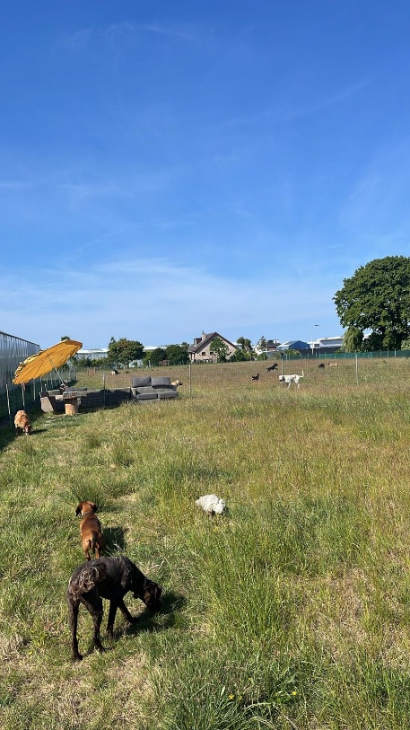 Dit is een groot omheind speelveld van ongeveer 7000M2 verdeeld in 5 grote speelvelden. We hebben hier een grote loods en diverse overkappingen op staan, voor schaduw in de zomer en schuilmogelijkheden bij slecht weer. Ook staan er bomen op het veld voor schaduw. Op ieder veld staat een overkapping om te schuilen. Per dag komen hier zeven groepen met honden spelen.